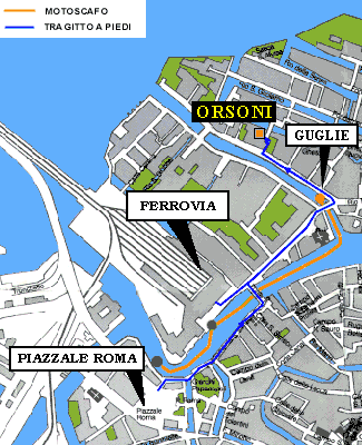 SE ARRIVATE ALL'AEROPORTO MARCO POLO di Venezia potete: - prendere un taxi acqueo privato direttamente dall'aeroporto fino al canale di Cannaregio, all'altezza del Sottoportego dei Vedei; - prendere l'autobus pubblico diretto per Venezia (autobus A.C.T.V. numero 5 , o bus navetta A.T.V.O.) e raggiungere Piazzale Roma in circa 20 minuti; - prendere un taxi stradale fino a Piazzale Roma quindi proseguire il tragitto da Piazzale Roma. SE ARRIVATE IN AUTOMOBILE dovrete parcheggiare la vostra automobile: - parcheggiando al Tronchetto, potete raggiungere Piazzale Roma con il motoscafo di linea pubblica A.C.T.V. numero 82 (5 minuti); - parcheggiando a Piazzale Roma, potete proseguire il tragitto da Piazzale Roma. SE ARRIVATE IN TRENO, scesi alla Stazione di Venezia Santa Lucia, potete raggiungerci: - facendo una passeggiata, (circa 15 minuti), seguite l'itinerario: Lista di Spagna; Ponte delle Guglie; Fondamenta di Cannaregio; Sottoportego dei Vedei. - prendendo il motoscafo di linea pubblica A.C.T.V. numero 42 oppure numero 52 (circa 5 minuti): dovete scendere alla prima fermata, GUGLIE e proseguire a sinistra lungo la Fondamenta di Cannaregio. |